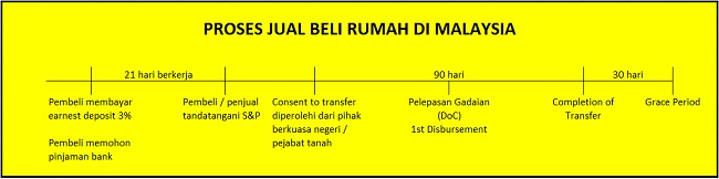 Amalan biasa, kontrak jual beli rumah menyatakan dalam tempoh 90 hari, transaksi perlu di selesaikan dalam tempoh ini. Antara proses yang akan berlaku dalam tempoh ini adalah pihak bank pembeli akan menjelaskan dahulu baki pinjaman penjual (Discharge of charge). Bank pembeli seterusnya akan membuat pembayaran kedua bagi menyelesaikan baki bayaran kepada pemilik. Kebanyakkan bank akan memastikan hakmilik telah bertukar antara penjual dan pembeli sebelum bank menjelaskan wang baki tersebut.